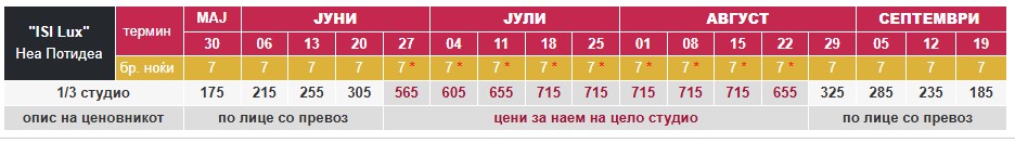 • –  Цените за 7ноќи / 8дена (со *), се дадени за наем на цело студио без вклучен превоз;