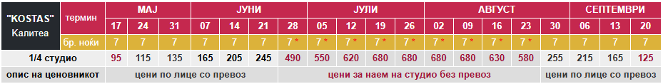 - – Цените за 7 ноќи/8 дена со *, се дадени за наем на цело студио без вклучен превоз;