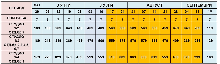 ЦЕНОВНИК ЗА НАЕМ НА СТУДИО ЗА 7 НОЌИ