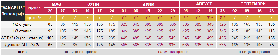 - – Цените за 7 ноќи/8 дена со *, се дадени за наем на цело студио/апартман без вклучен превоз;