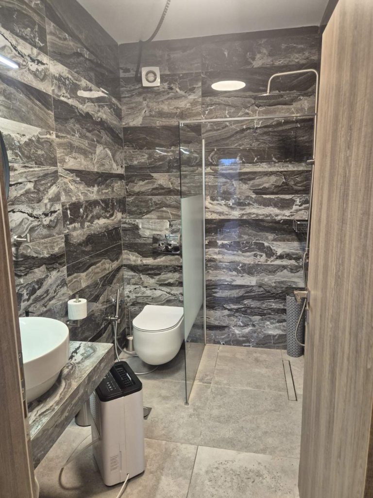 1/5 дуплекс – бр.1 – се наоѓа на прв спрат.Дуплексот располага со три големи простории.Има 2 посебни спални соби со брачни кревети и дневна просторија поврзана со трпезарија и кујна каде се наоѓа и кауч кој не се спушта.Кујната е целосно опремена, со најнов инвентар,исто така располага со тоалет и балкон на кој се излегува и има летна гарнитура за седење. Може да се сместат максимум 4 возрасни лица и 2 деца до 12 години. ( Има можност да се стави дополнително легло доколку се 2 деца до 12г)