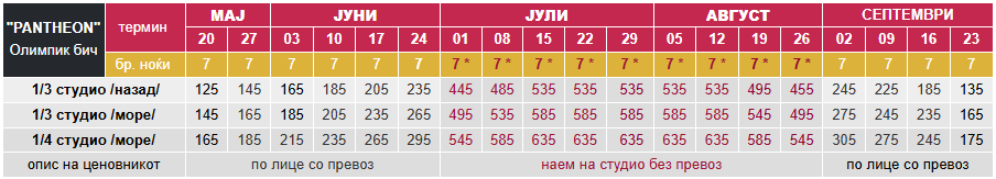 - – Цените за 7 ноќи/8 дена со *, се дадени за наем на цело студио без вклучен превоз;