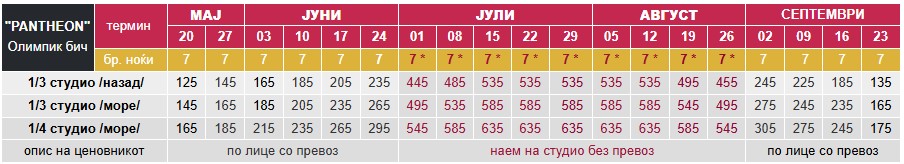 - – Цените за 7 ноќи/8 дена со *, се дадени за наем на цело студио без вклучен превоз;