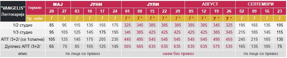 • –  Цените за 7 ноќи/8 дена со *, се дадени за наем на цело студио/апартман без вклучен превоз;