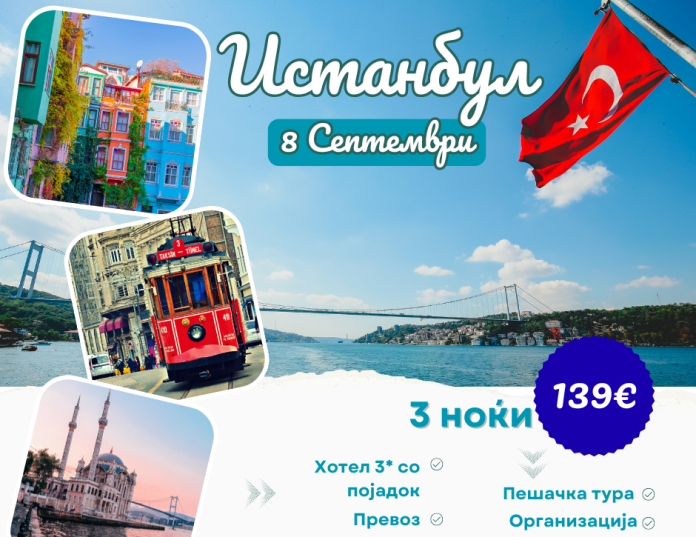 Уживајте во градот на два континента, прекрасниот Босфор во месец септември. Истанбул е прекрасен во секоја доба на годината. ПРОМО ЦЕНА НА АРАНЖМАНОТ 119евра, РЕДОВНА ЦЕНА 149 евра. ЦЕНАТА НА АРАНЖМАНОТ ВКЛУЧУВА: Две ноќевања во хотел 3* со појадок во населбата Аксарај/Лалели Автобуски превоз на релација Скопје – Истанбул – Скопје Пешачка тура низ стариот...Read More
